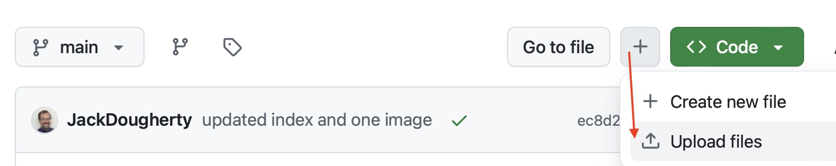 All of your data visualizations should be interactive. But if you need to insert a static image, you can prepare a JPG or PNG file (preferably with all lower-case text and no spaces in the filename) and upload it directly into your GitHub repo, as shown below: