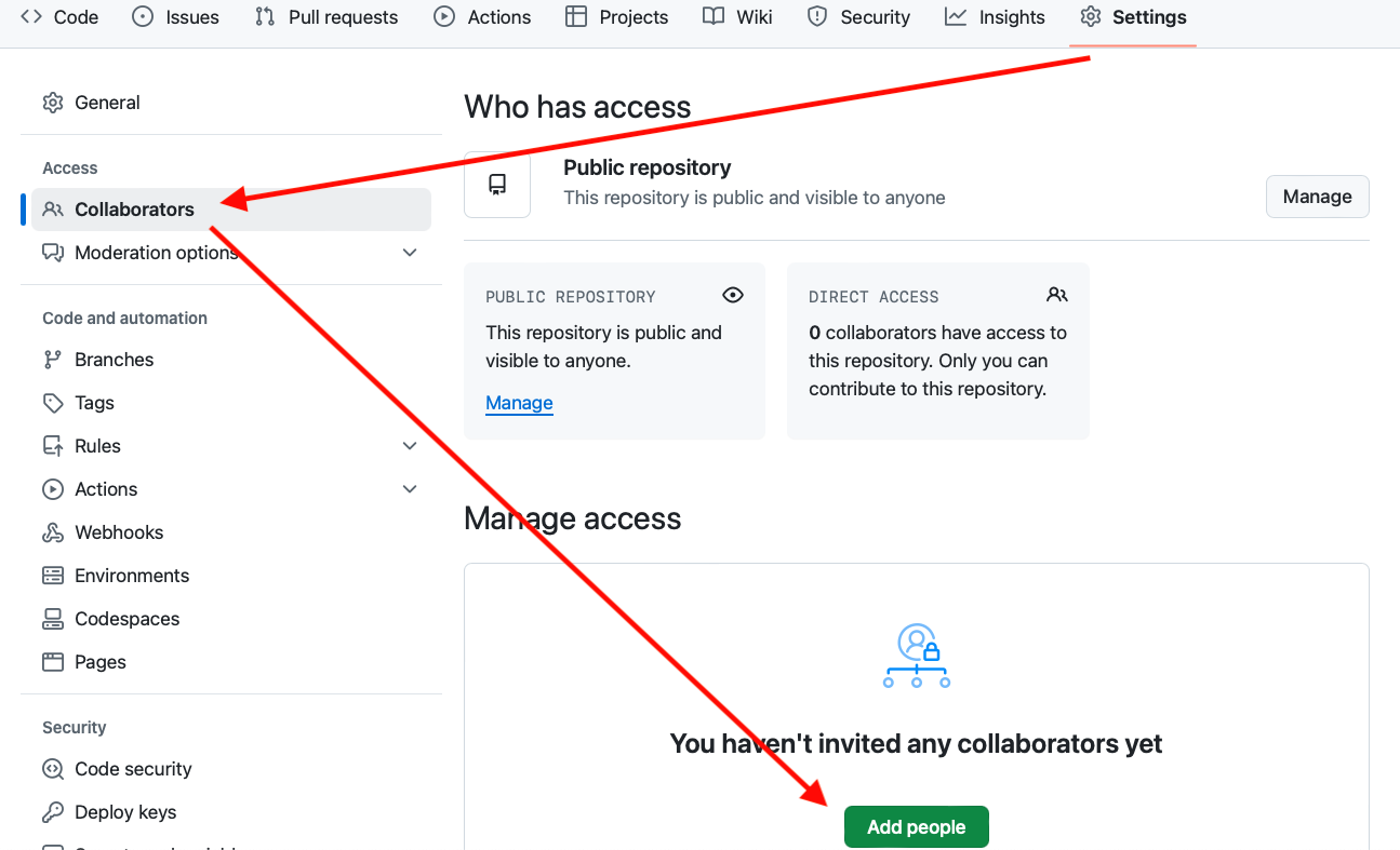 Compose and edit your data story in Google Docs, where co-authors can work simultaneously. When you're ready to migrate to GitHub, create ONE data story template in ONE author's GitHub account, because only ONE person can edit at a time. But the GitHub account owner can go to Settings > Collaborators > Add People to invite a co-author by using their GitHub username, as shown below. But be careful not to overwrite each other's edits!