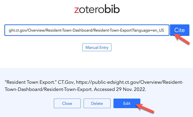 Image 1: After inserting a URL into the ZBib.org tool, you may need to click the Edit button to manually add missing details.