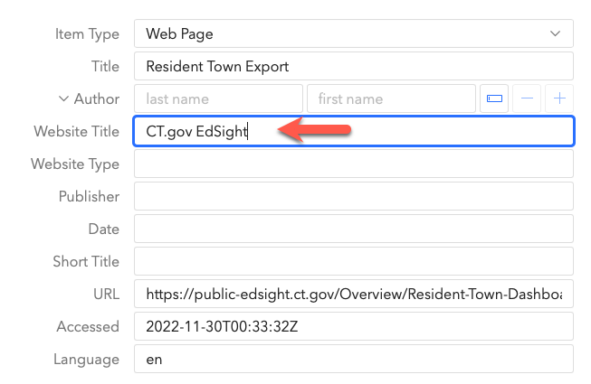 Image 2: Clicking the Edit button in ZBib allows you to enter or correct missing details, such as the full Website Title.
